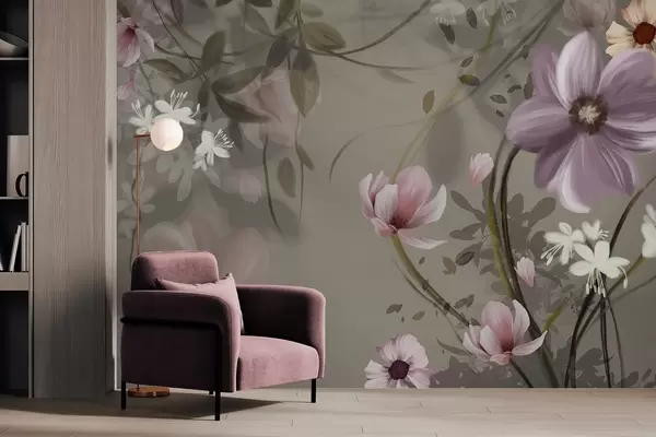 Fototapeten Rosa und weiße Blumen mit braunen Stielen und Blättern, sanfte Beleuchtung, gedämpfte Farben, Blumenarrangement N° w09417