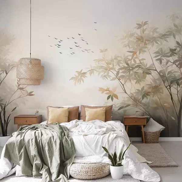 Fototapeten Strukturierte Landschaft mit Bäumen und einem Vogelschwarm am Himmel, Pastellfarben, Naturszene N° w09418