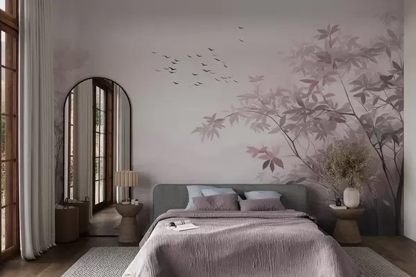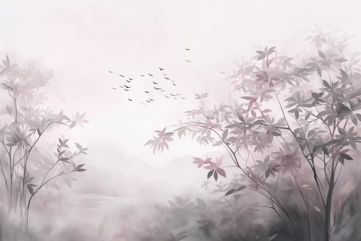 Fototapeten Strukturierte Landschaft mit Bäumen und einem Vogelschwarm am Himmel, Pastellfarben, Naturszene N° w09418v1