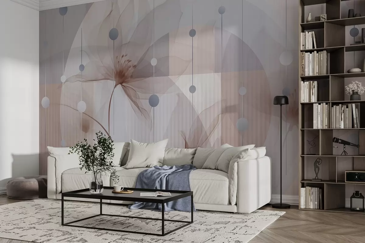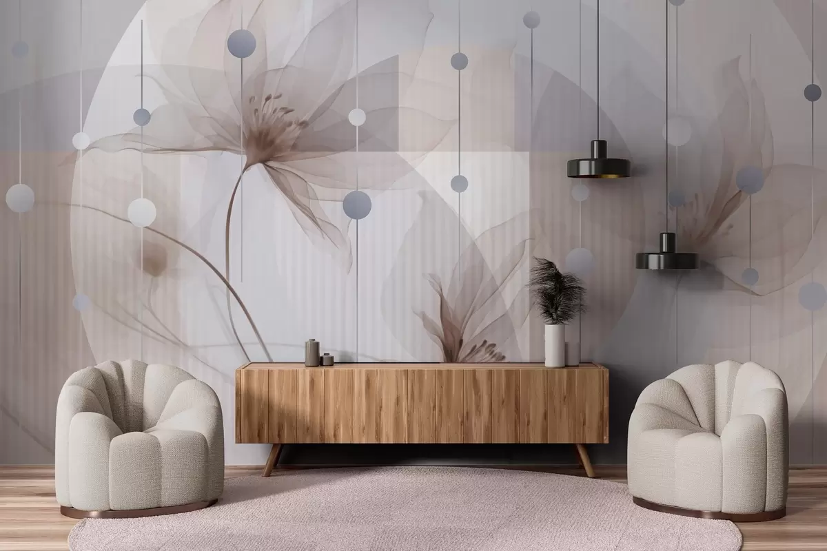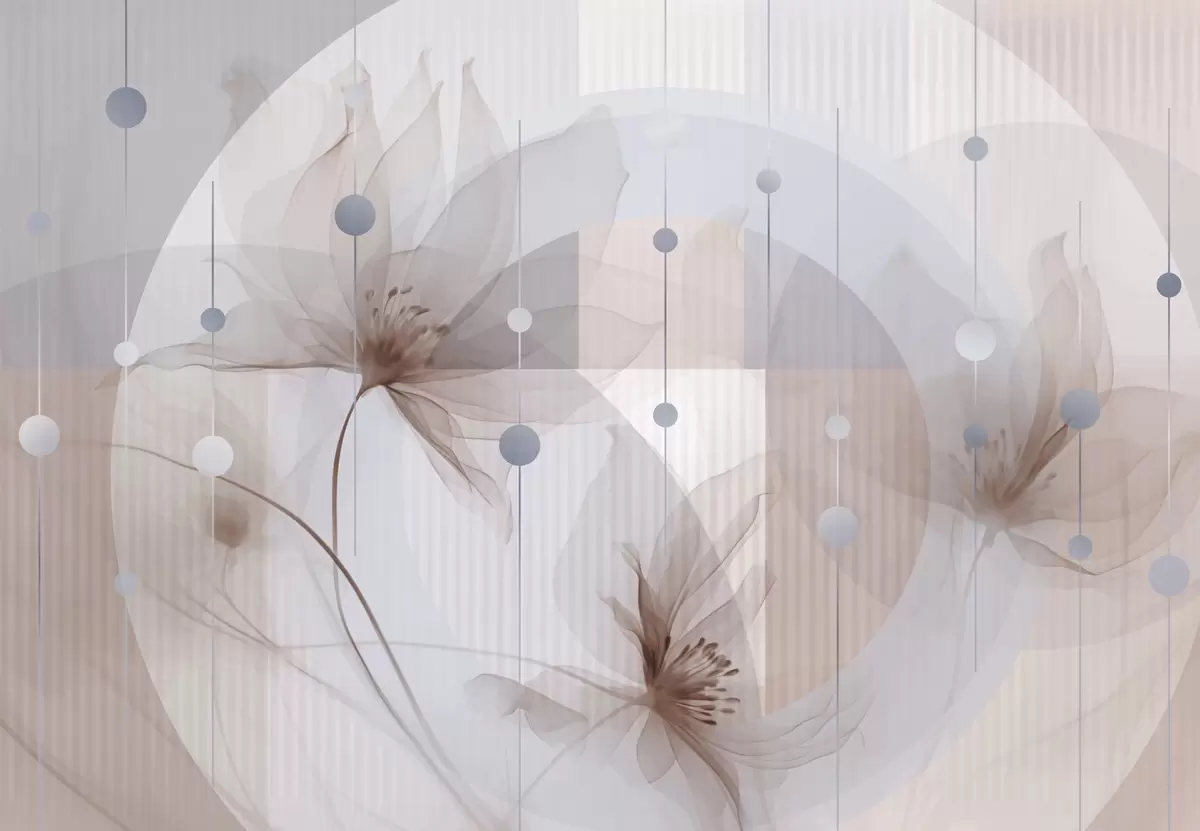 Fototapeten Abstrakte durchscheinende Blumen, Kreise und geometrische Formen, Pastellblau, Braun und Weiß als Farbpalette N° w09419v1