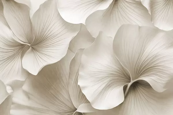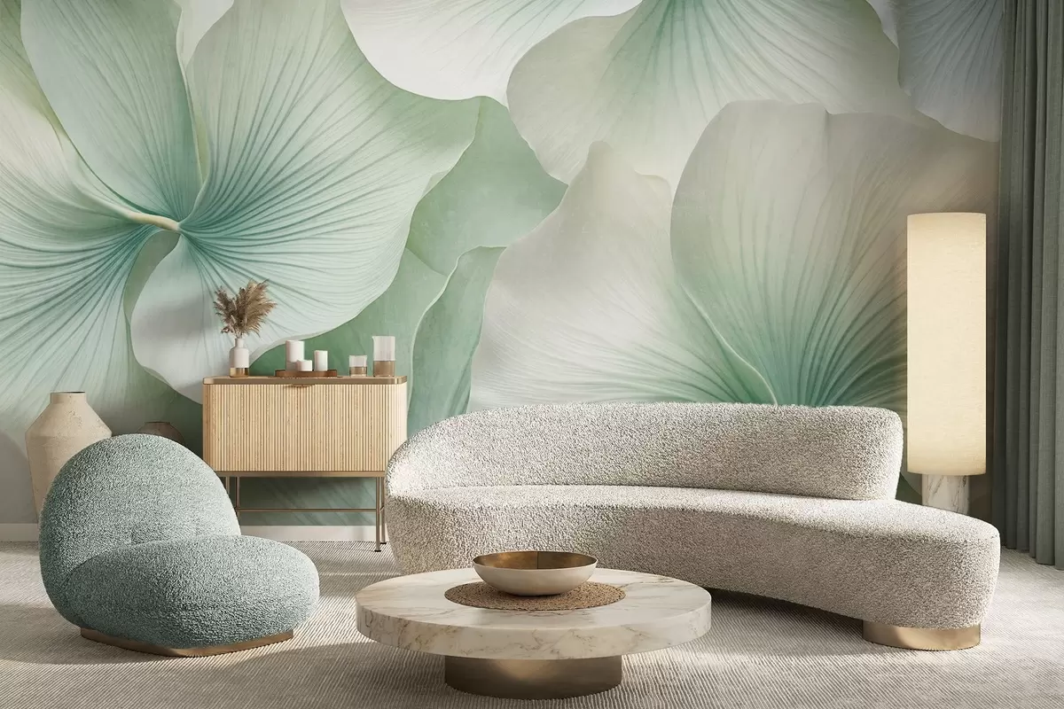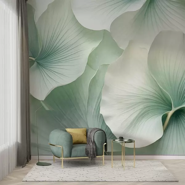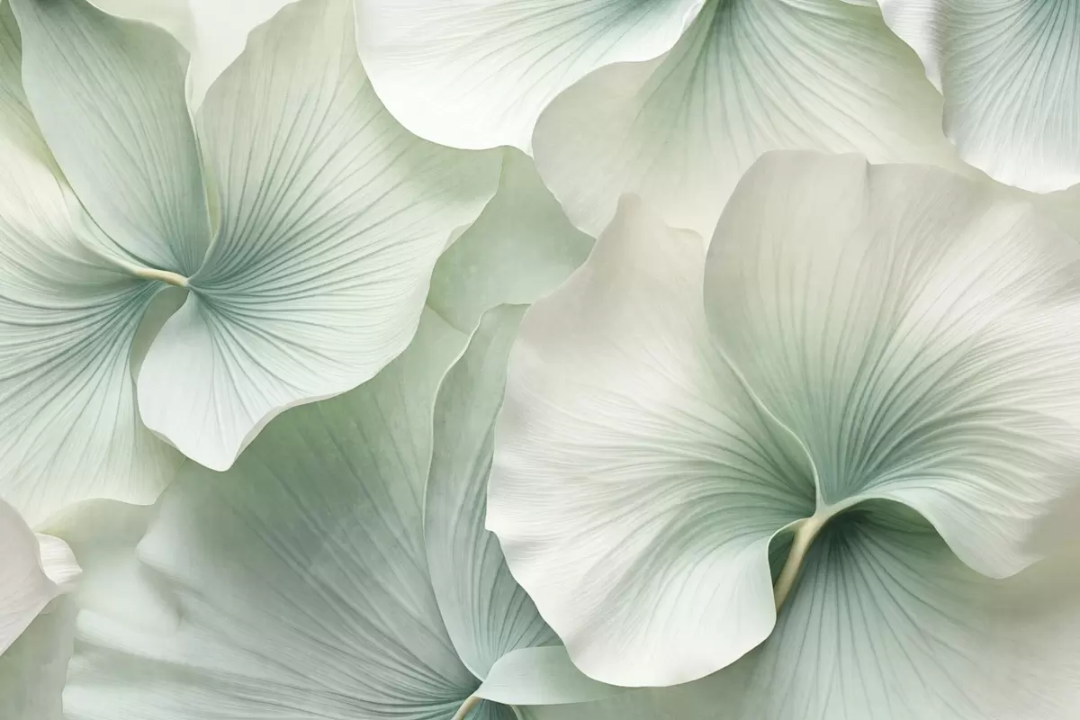 Fototapeten Weiße und grüne Ginkgoblätter, weiche Textur, abstrakter Blumenhintergrund, minimalistischer moderner Stil N° w09421