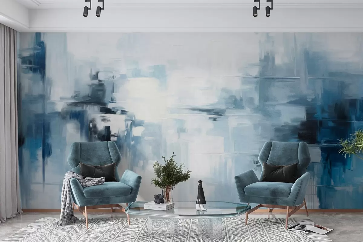 Fototapeten Abstrakte Landschaftsmalerei mit blauen und weißen Pinselstrichen, moderner Stil N° w09422