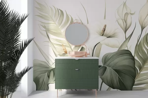 Fototapeten Weiße Callalilien und grüne tropische Blätter, botanische Illustration, heller Hintergrund, Vintage-Stil, strukturiert N° w09423