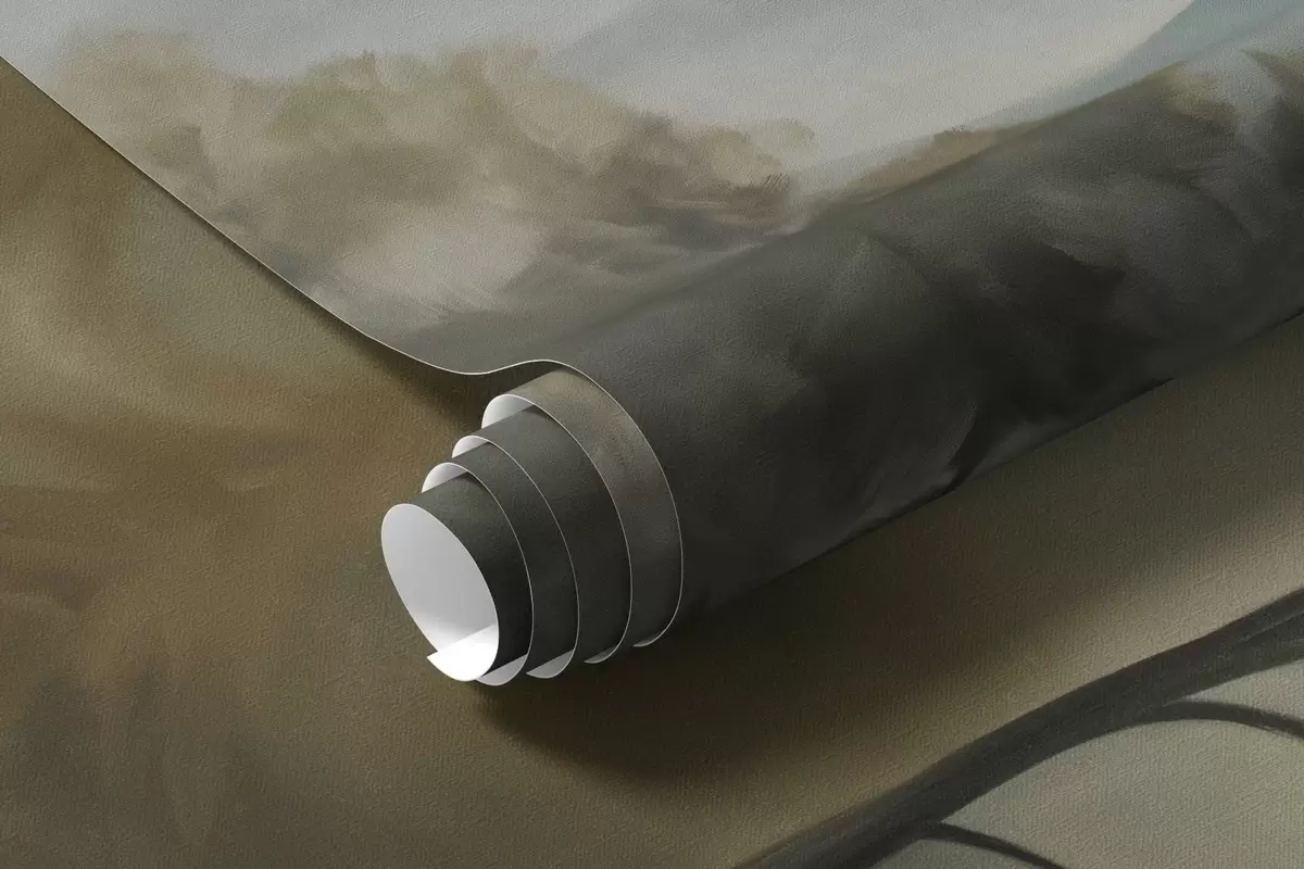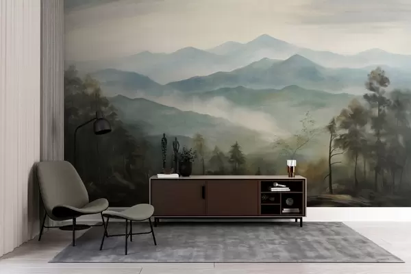 Fototapeten Nebelverhangene Bergkette mit Bäumen, Nebel, bewölktem Himmel, gedämpften Farben, Landschaftsmalerei-Stil N° w09424