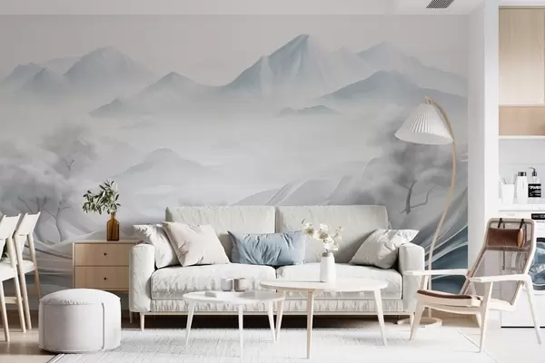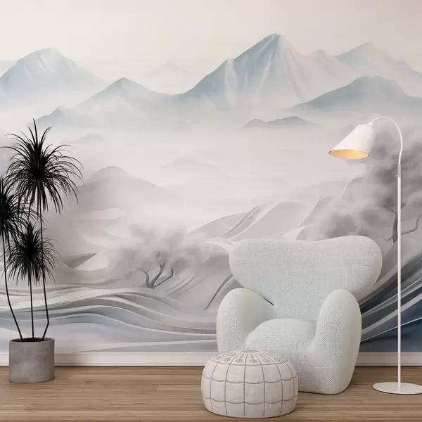 Fototapeten Verschneite abstrakte dekorative Berglandschaft mit weißen Bäumen und Nebel, minimalistischer strukturierter Stil N° w09426