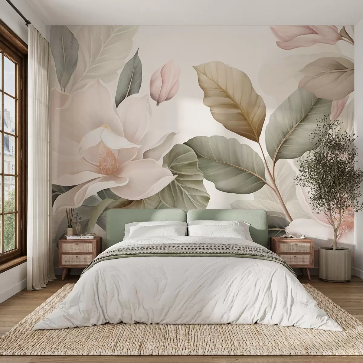 Fototapeten Magnolienblüten mit Blättern in Pastellfarben, weiß, rosa und grün, zart, delikat, im Aquarellstil N° w09427