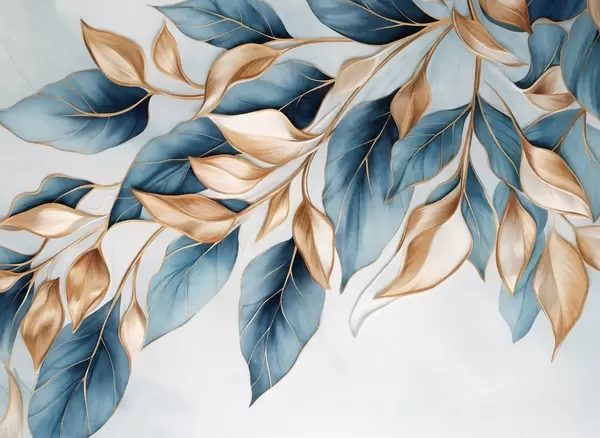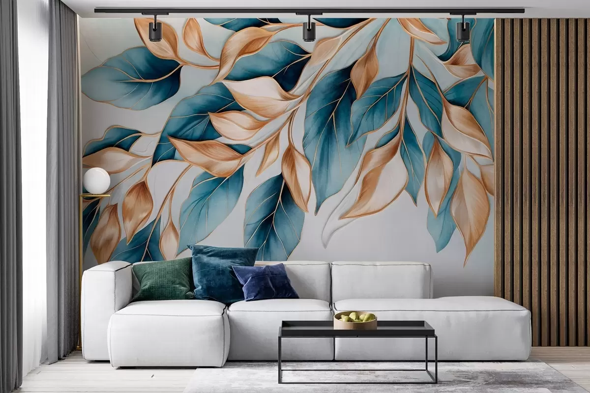 Fototapeten Strukturierte blaue und orangefarbene Blätter, hellblauer Hintergrund, elegantes und künstlerisches Design, moderner Stil N° w09429