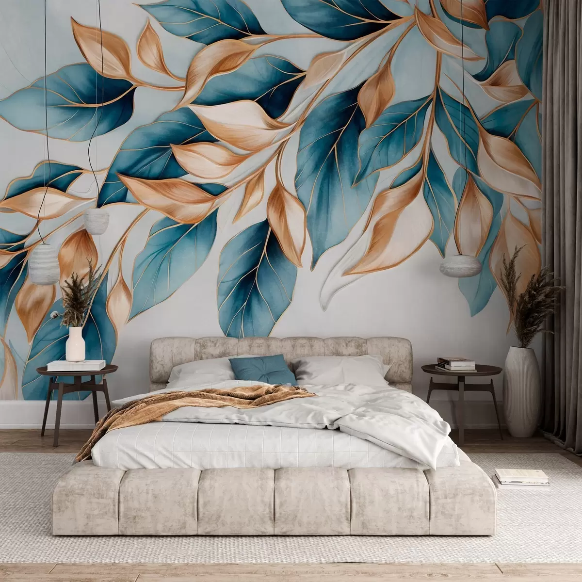 Fototapeten Strukturierte blaue und orangefarbene Blätter, hellblauer Hintergrund, elegantes und künstlerisches Design, moderner Stil N° w09429