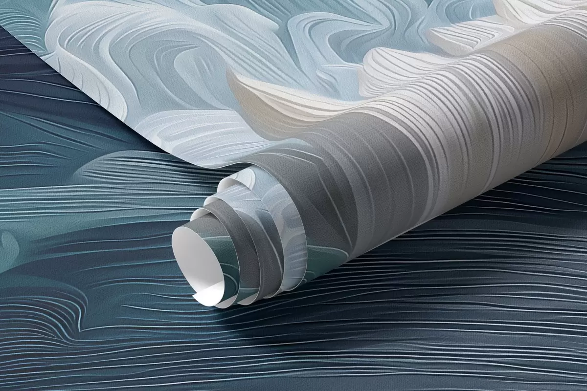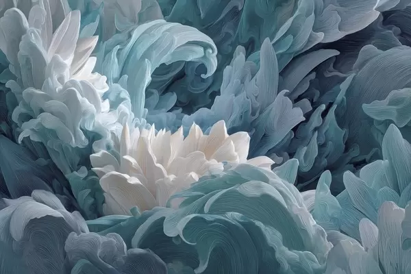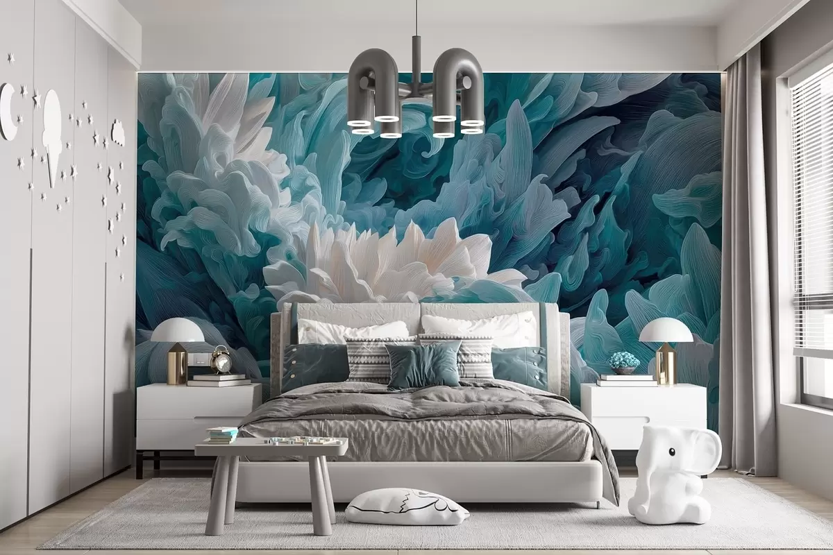 Fototapeten Tanz der Blütenblätter und Meereswellen in Blautönen N° w09454
