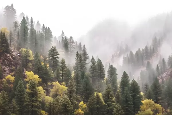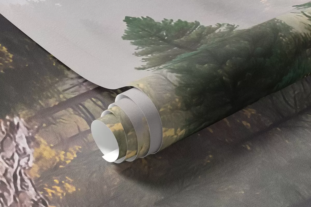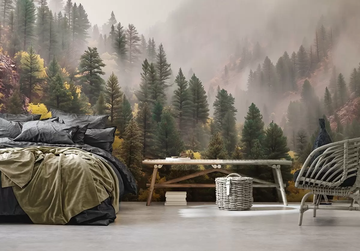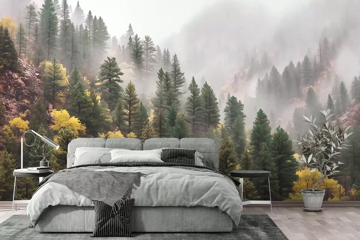 Fototapeten Atmosphärischer, nebliger Kiefernwald in den Bergen N° w09463