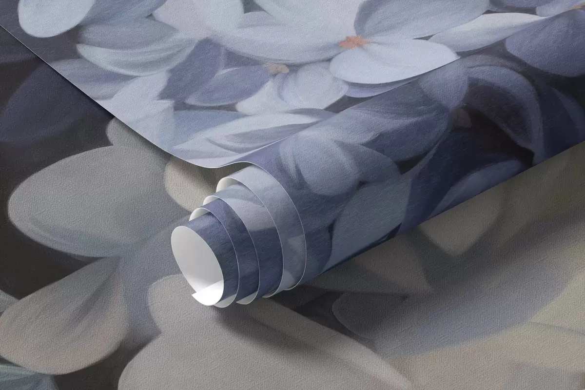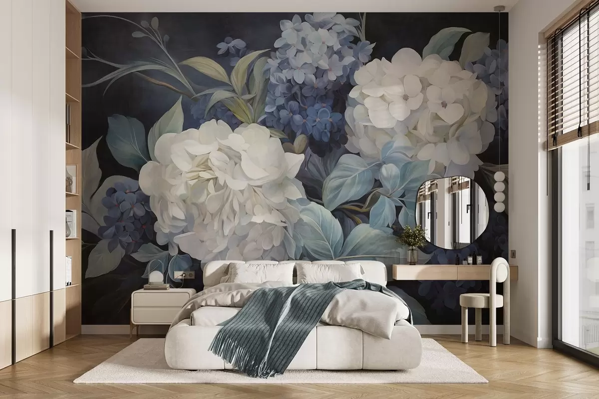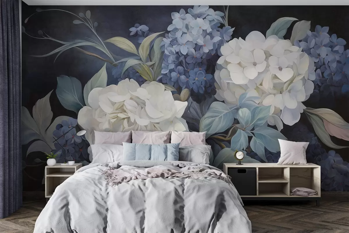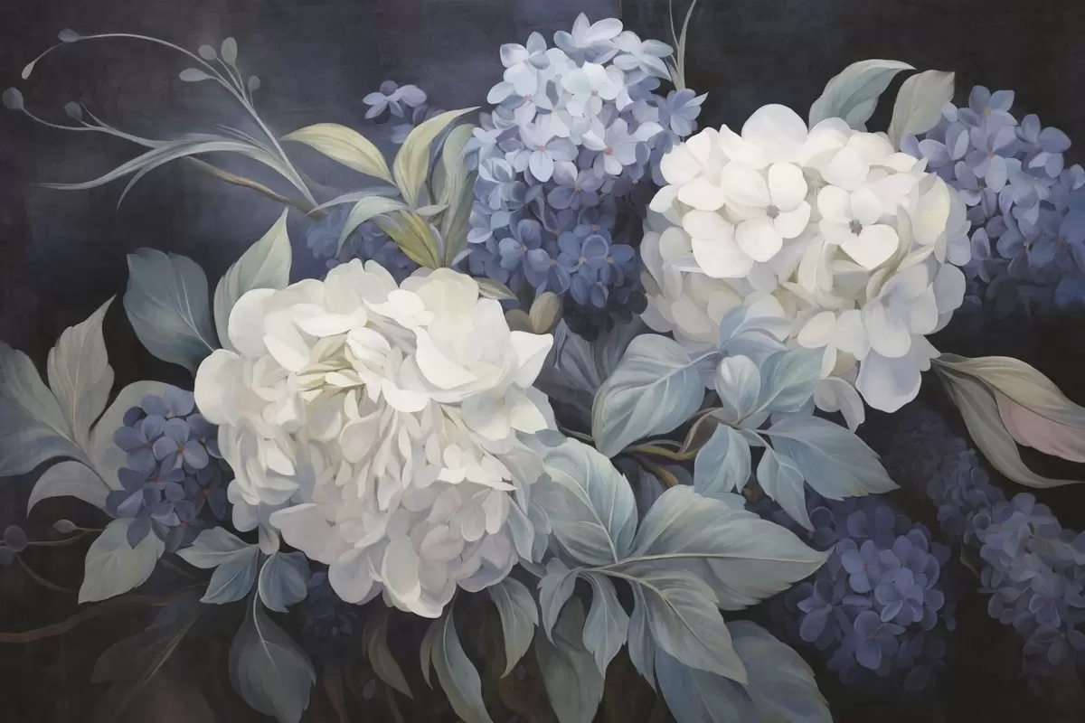 Fototapeten Strukturierte dunkelblaue Malerei, die Hortensienblüten mit großen Blättern imitiert, abstrakter und dunkler Hintergrund N° w09465v1