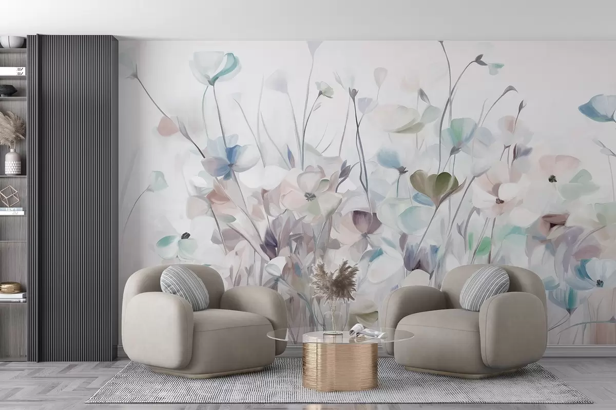 Fototapeten Abstraktes Feld aus blauen und braunen Blumen mit langen Stielen und Blättern, strukturiert, pastellfarben, gedeckte Farben N° w09466v1