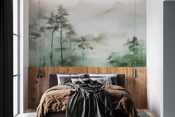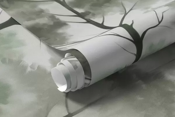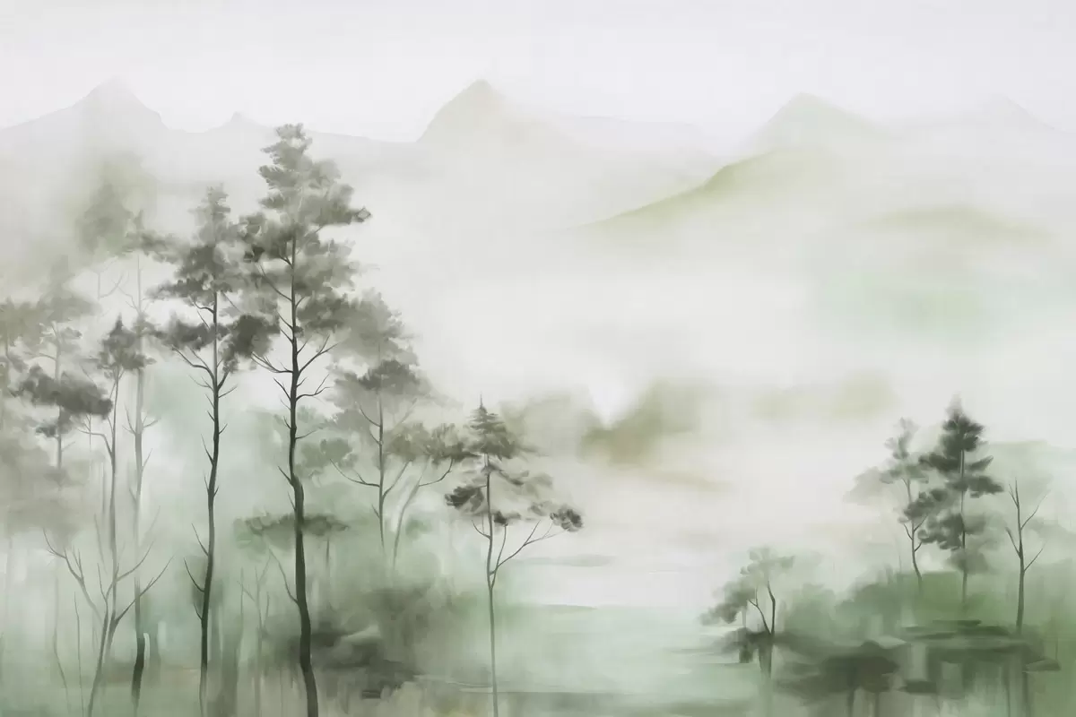 Fototapeten Neblige Landschaft mit hohen Bäumen und Bergen in gedämpften Grün- und Grautönen, minimalistischer Stil, strukturiert N° w09469