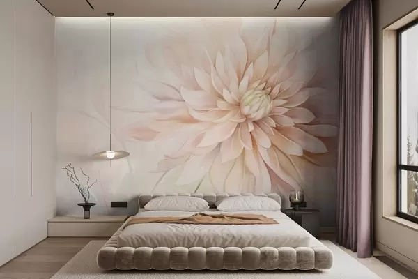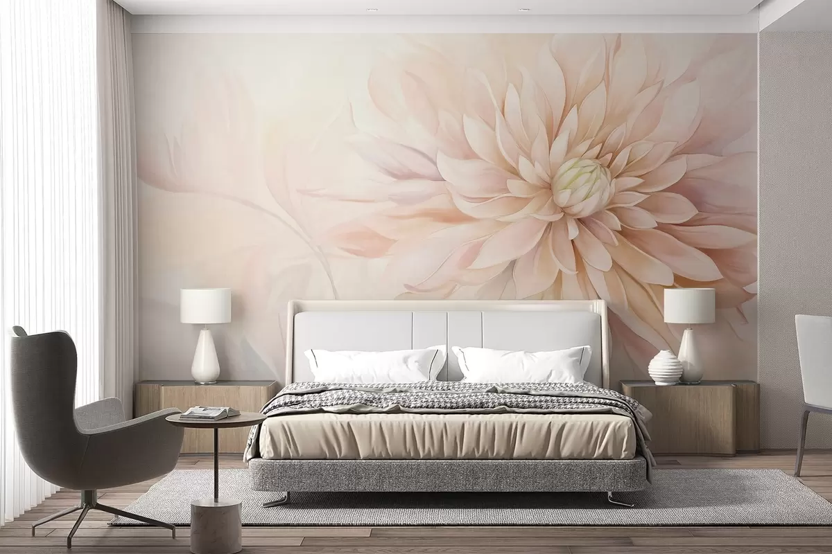Fototapeten Eine hellrosa Dahlienblüte mit vielen Blütenblättern, weicher Pastellhintergrund mit einem Hauch von Grün und Beige N° w09470