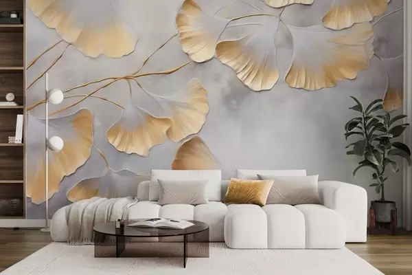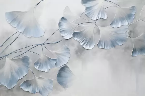 Fototapeten Ginkgo-Biloba-Blätter mit gelben Rändern an einem Ast, grauer strukturierter Hintergrund, elegantes und minimalistisches Design N° w09472