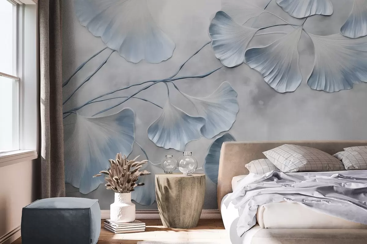 Fototapeten Ginkgo-Biloba-Blätter mit blauen Rändern an einem Ast, grauer strukturierter Hintergrund, elegantes und minimalistisches Design N° w09472v1