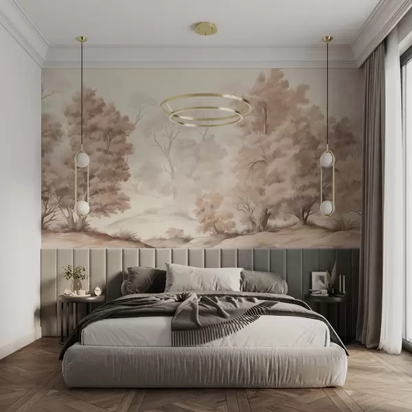 Fototapeten Strukturierte Landschaftsmalerei, die einen Wald mit hohen Bäumen und Gras imitiert, gedämpfte und sanfte Farben, beruhigende Szene N° w09474