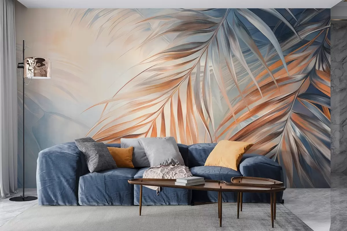 Fototapeten Palmenblätter in Orange- und Blautönen, heller strukturierter Hintergrund mit sanften Farben, eleganter tropischer Stil N° w09475