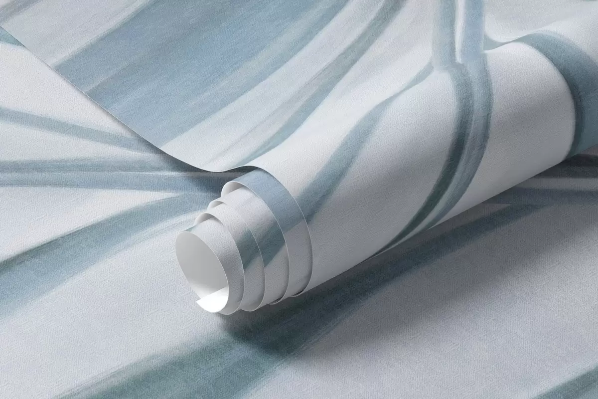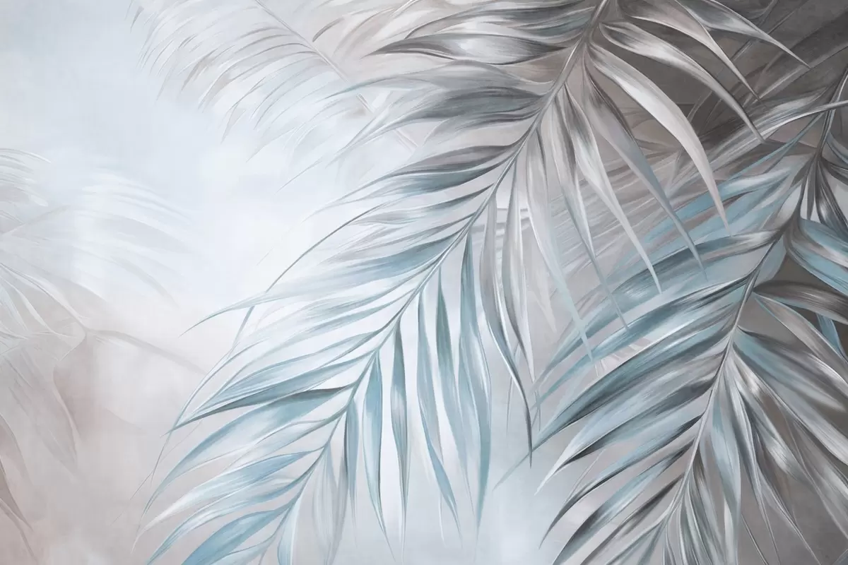 Fototapeten Palmblätter in Grau- und Blautönen, heller strukturierter Hintergrund mit sanften Farben, eleganter tropischer Stil N° w09475v1
