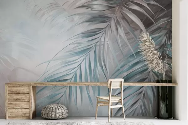 Fototapeten Palmblätter in Grau- und Blautönen, heller strukturierter Hintergrund mit sanften Farben, eleganter tropischer Stil N° w09475v1
