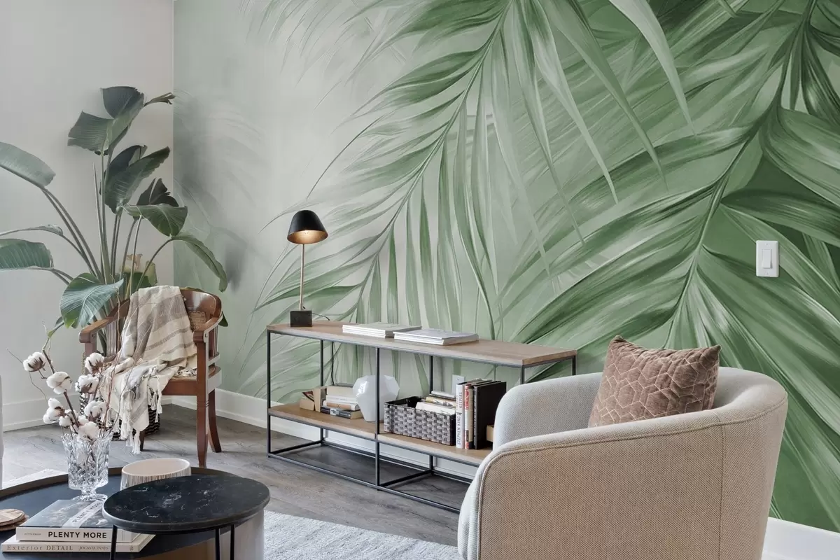 Fototapeten Palmblätter in Grüntönen, heller strukturierter Hintergrund mit sanften Farben, eleganter tropischer Stil N° w09475v2