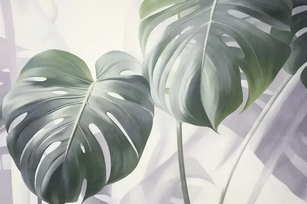 Fototapeten Strukturierte Monstera-Blätter, groß und grün, vor einem weichen, hellen abstrakten Hintergrund N° w09477