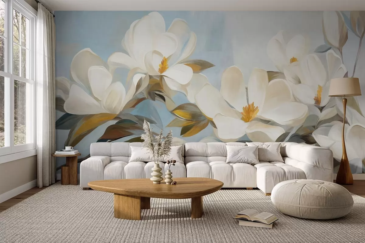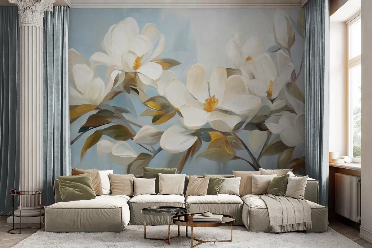 Fototapeten Weiße Magnolien mit grünen Blättern auf hellblauem Hintergrund mit abstrakten Pinselstrichen N° w09478