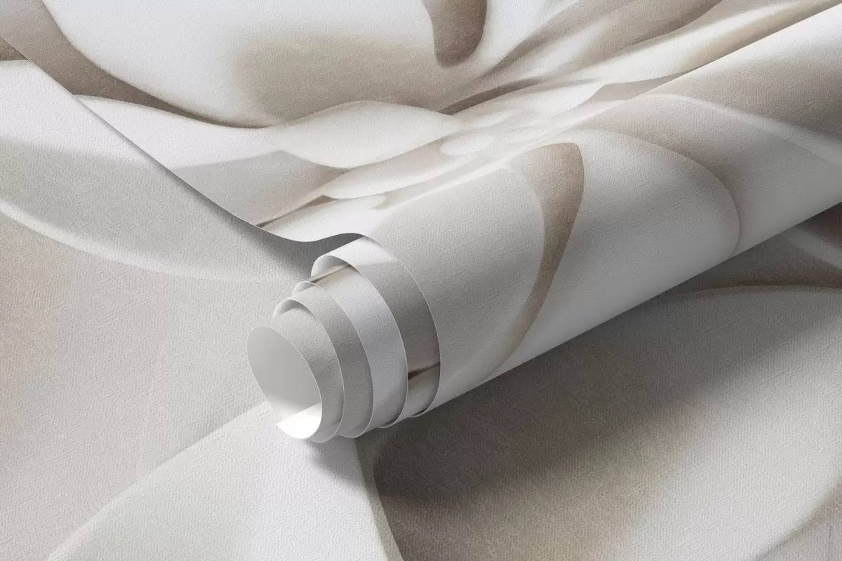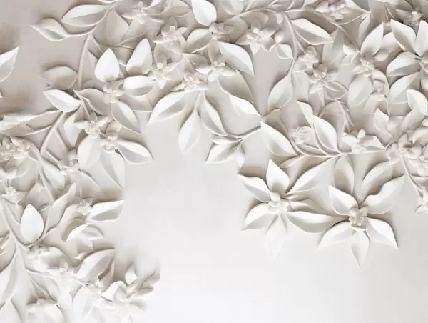 Fototapeten Weiße strukturierte Blumen und Blätter, Blumenarrangement, elegantes Design, minimalistischer Stil, dekorative Kunst N° w09479