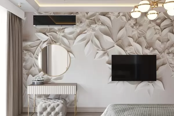 Fototapeten Weiße strukturierte Blumen und Blätter, Blumenarrangement, elegantes Design, minimalistischer Stil, dekorative Kunst N° w09479