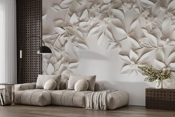 Fototapeten Weiße strukturierte Blumen und Blätter, Blumenarrangement, elegantes Design, minimalistischer Stil, dekorative Kunst N° w09479