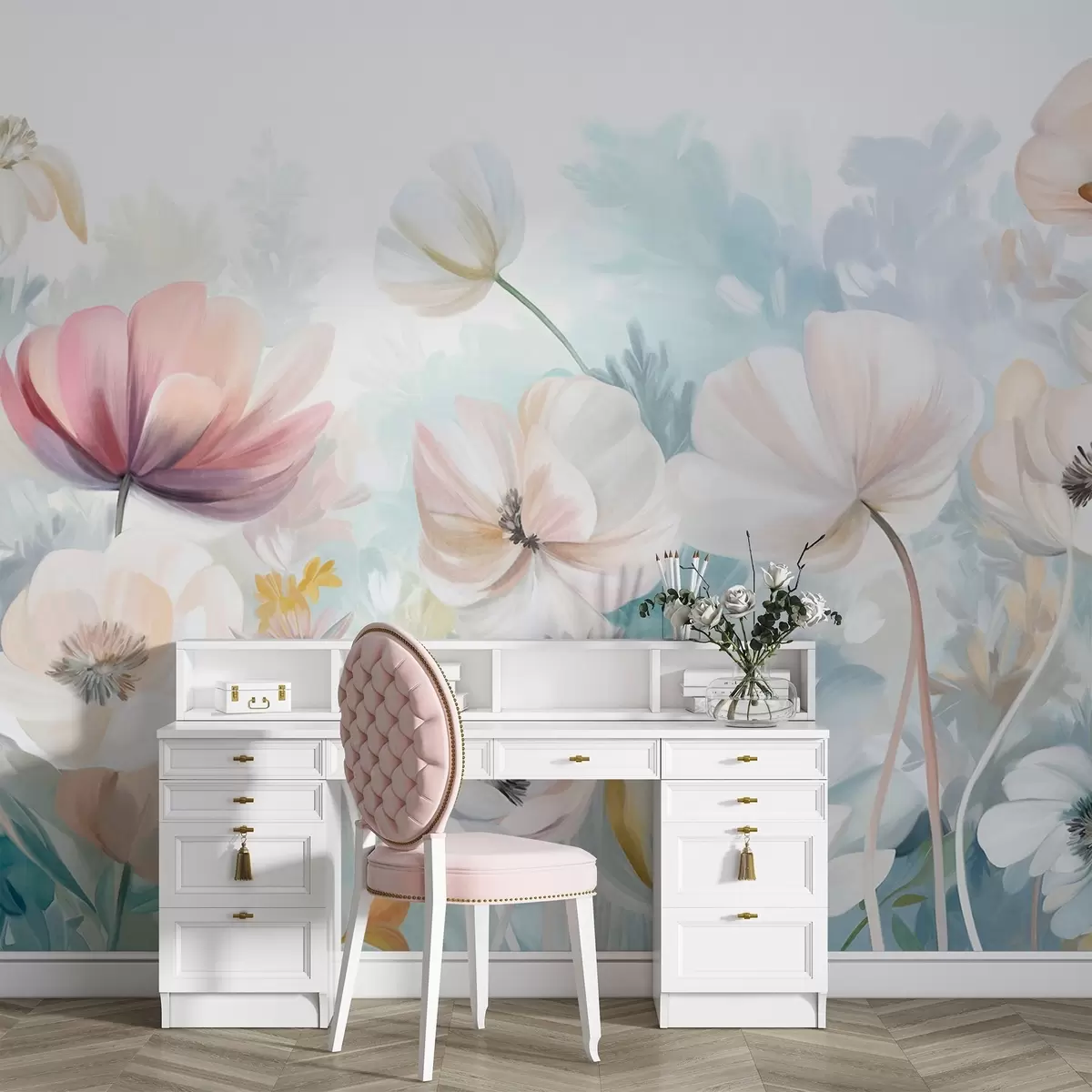 Fototapeten Ein Feld mit pastellfarbenen Blumen mit zarten Blütenblättern und weichen grünen Blättern, in einem verträumten, strukturierten Aquarellstil N° w09481