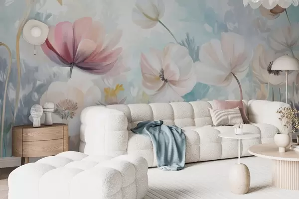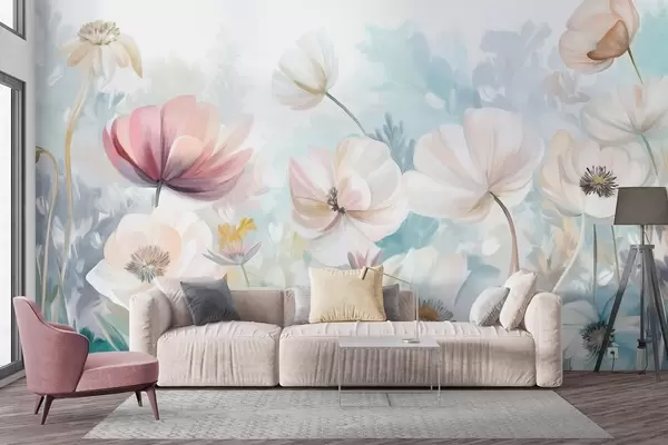 Fototapeten Ein Feld mit pastellfarbenen Blumen mit zarten Blütenblättern und weichen grünen Blättern, in einem verträumten, strukturierten Aquarellstil N° w09481