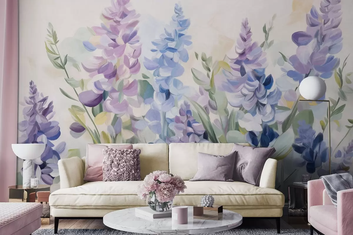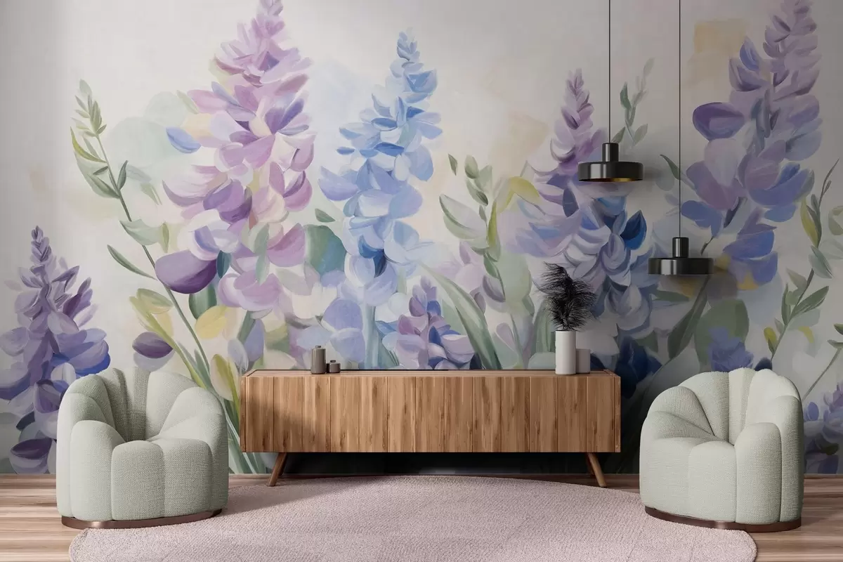Fototapeten Lila und blaue strukturierte Blumen mit blauen Blättern, heller Hintergrund, weiche Pinselstriche, lebendige Farben N° w09482