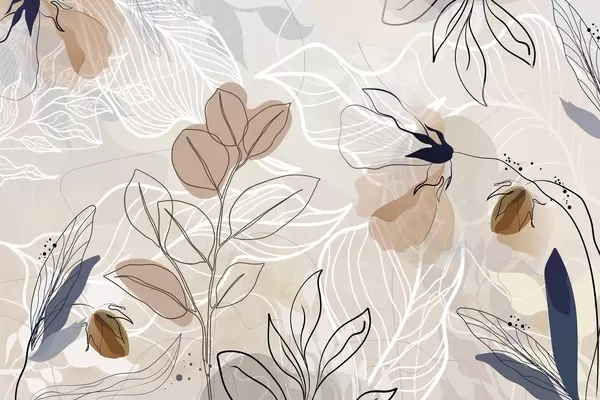 Fototapeten Beiger abstrakter Hintergrund mit Blatt- und Blumenlinienkunst, modern, minimalistisch, organische Formen, botanischer Druck N° w09487