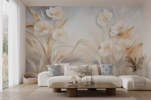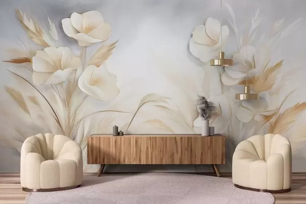 Fototapeten Weiße Blumen, beigefarbenes Schilf und Pampasgras, strukturiert, elegant, minimalistischer Stil, abstrakter Landschaftshintergrund N° w09490