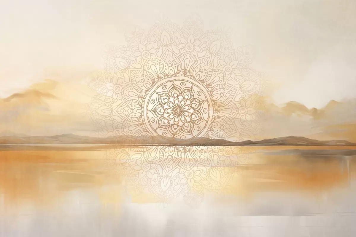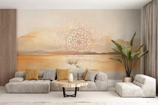 Fototapeten Strukturiertes symmetrisches Mandala-Design überlagert eine Landschaft mit Meer, Hügeln und Himmel in sanften Pastellfarben N° w09491