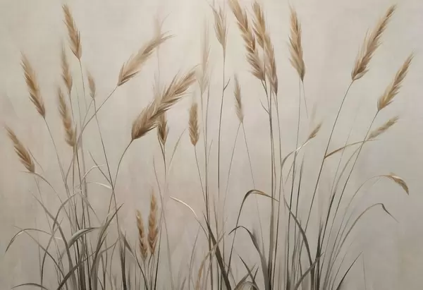 Fototapeten Weizenfeld mit gelben Ähren, beiger Hintergrund, natürliches Licht, warme Farbtöne, detaillierte Pinselstriche N° w09493
