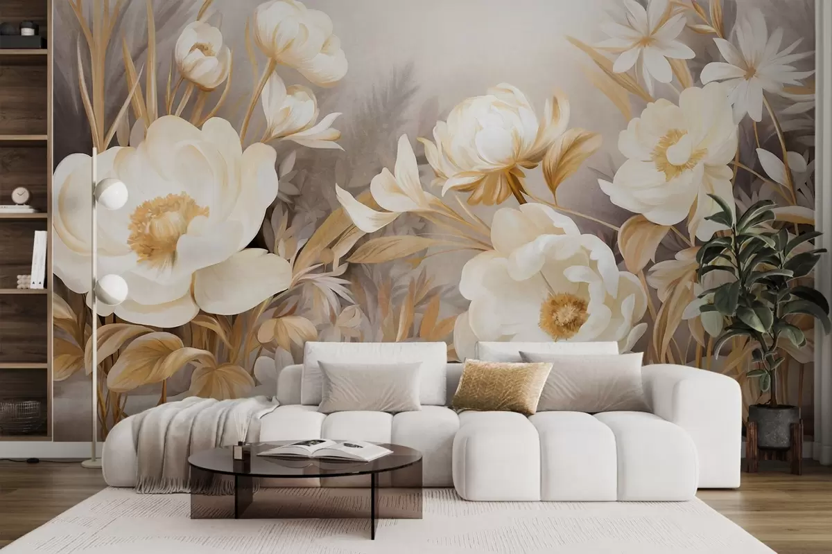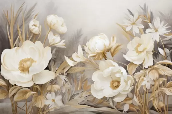 Fototapeten Weiße und gelbe Pfingstrosen und andere Blumen mit hohem Gras und Blättern in einem weichen, malerischen Stil mit strukturierter Textur. N° w09494