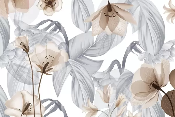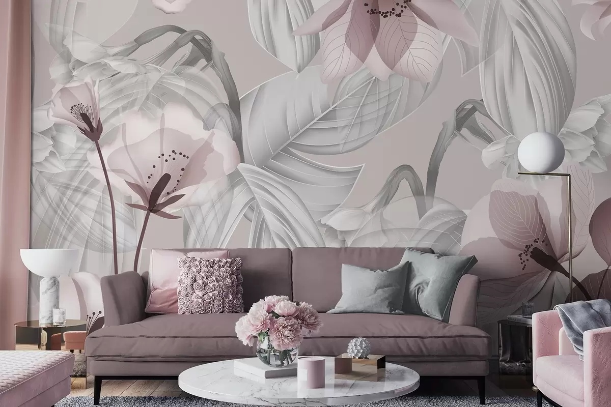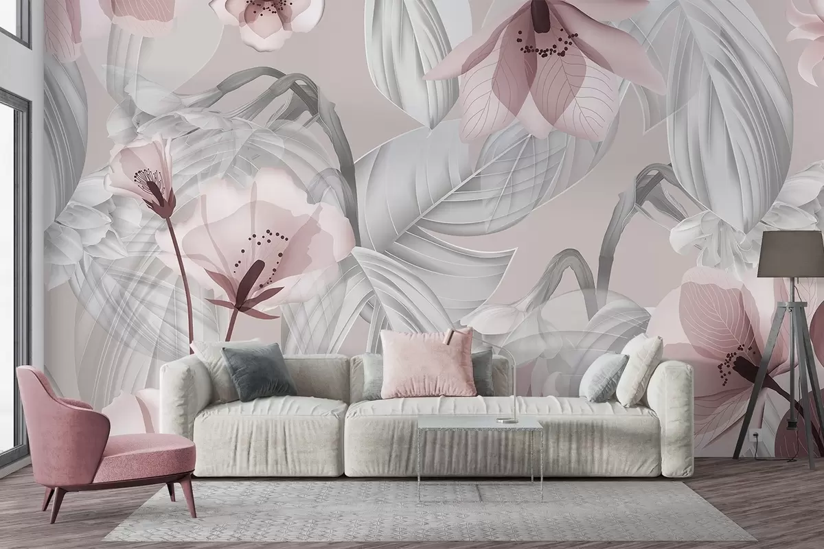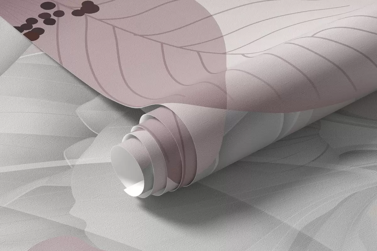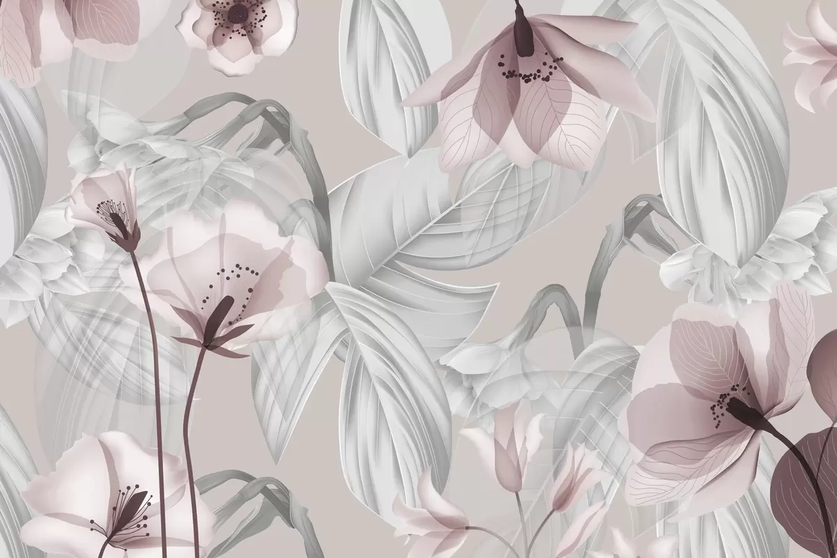 Fototapeten Rosa Blüten und graue Blätter, botanischer Blumenhintergrund, elegantes Design, sanfte Farben, zarte Details N° w09497