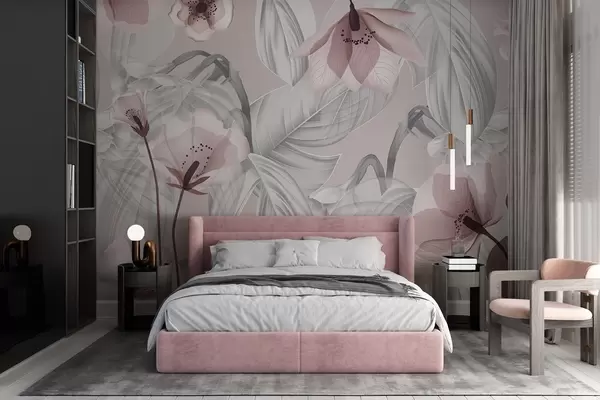 Fototapeten Rosa Blüten und graue Blätter, botanischer Blumenhintergrund, elegantes Design, sanfte Farben, zarte Details N° w09497