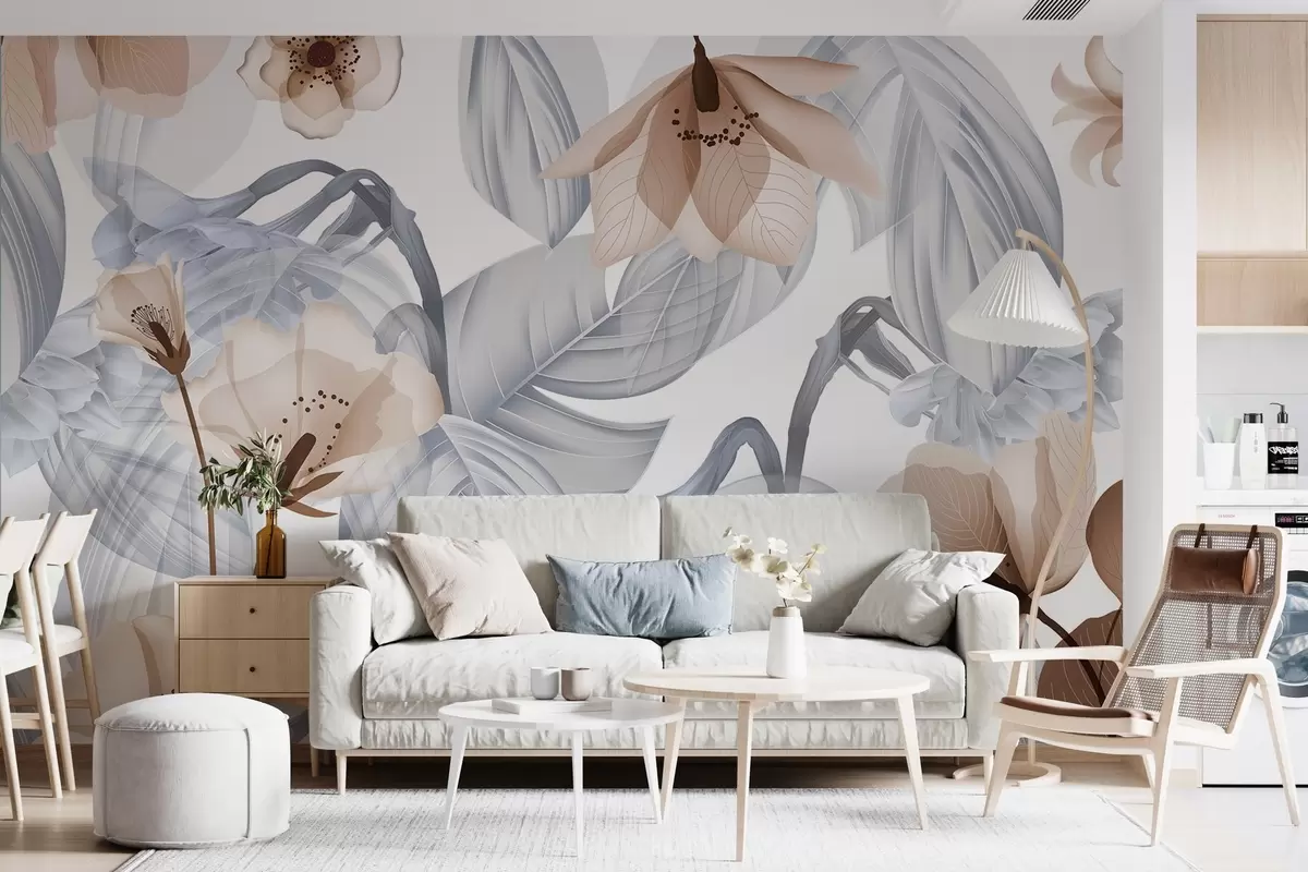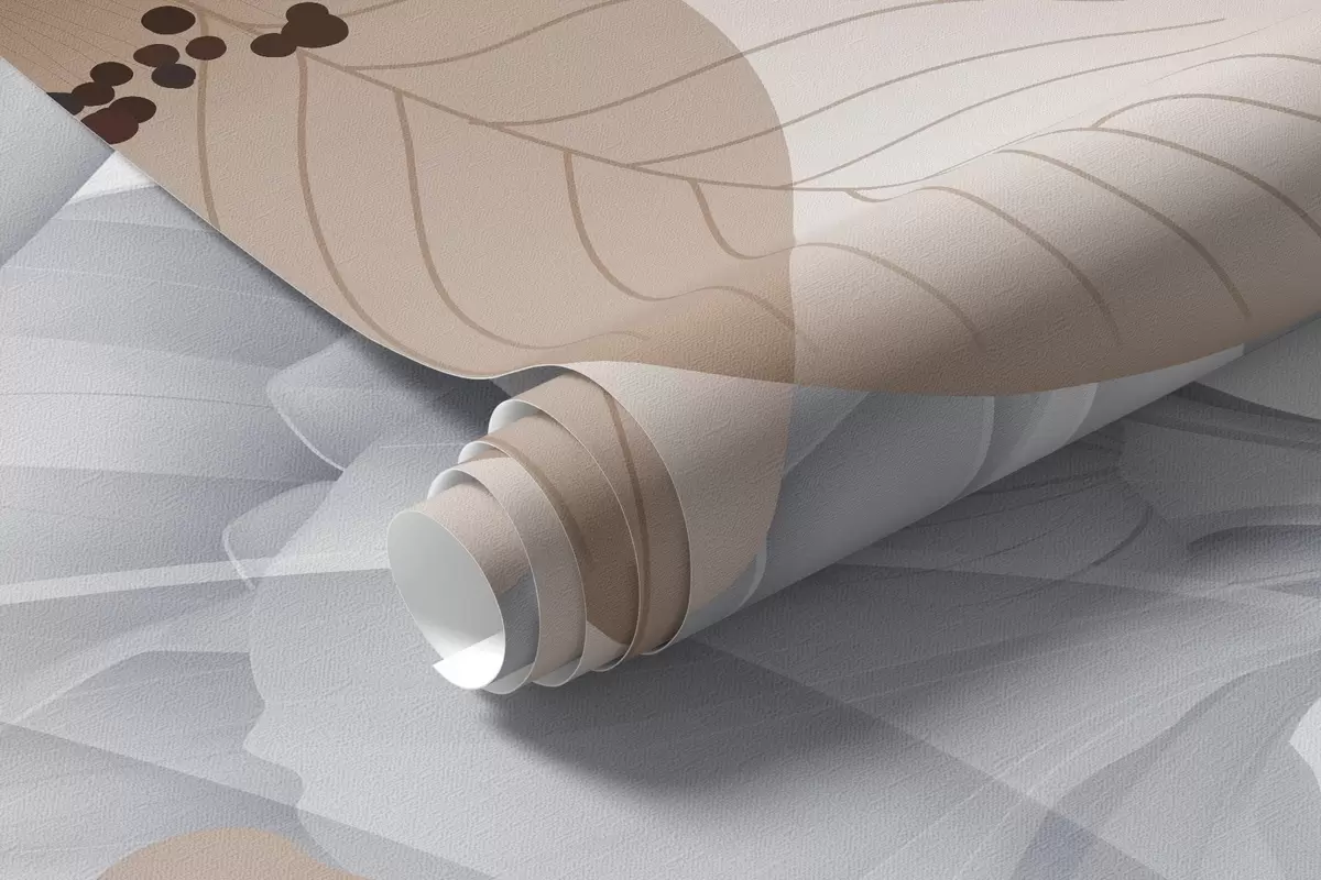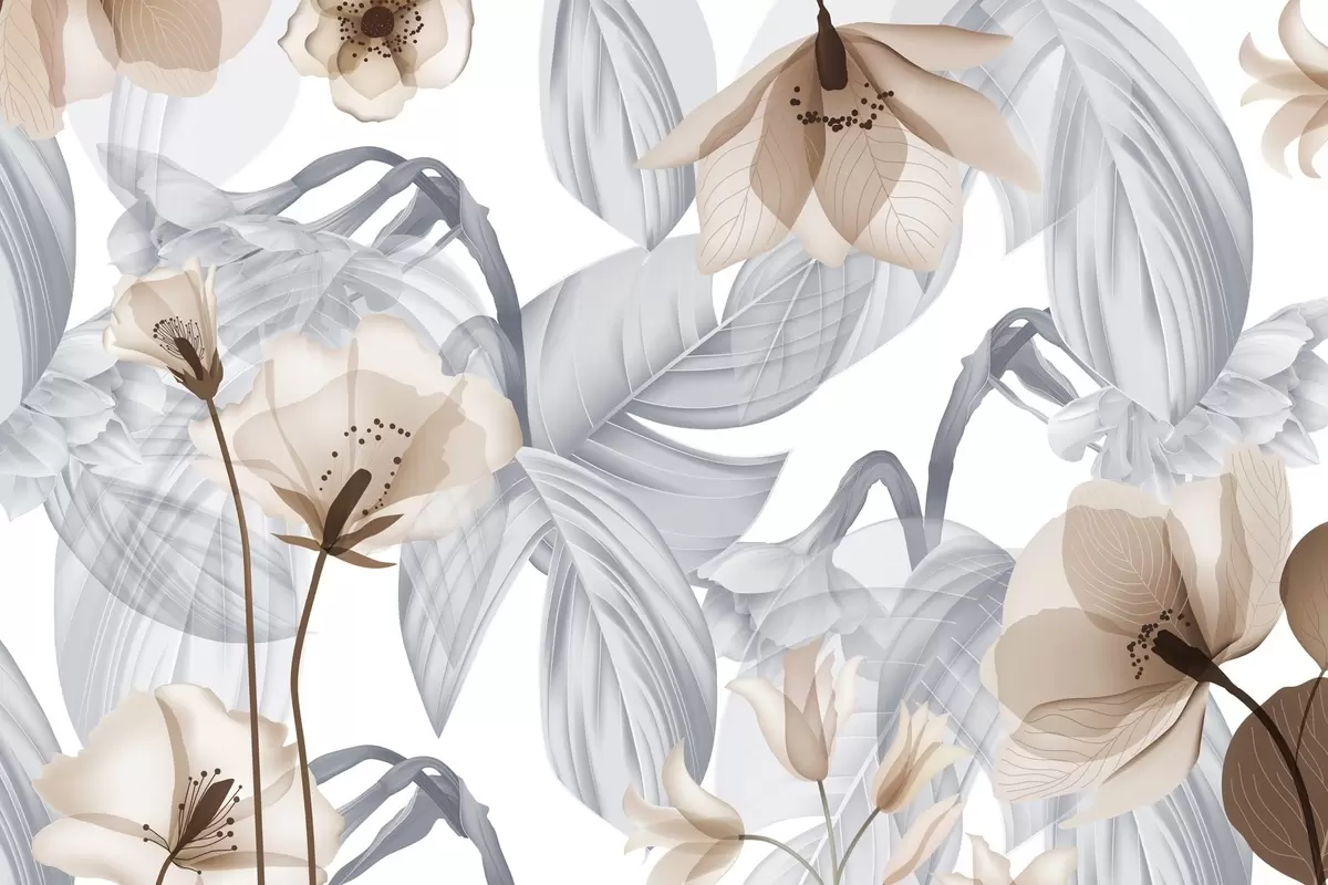 Fototapeten Braune Blüten und graue Blätter, botanischer Blumenhintergrund, elegantes Design, sanfte Farben, leichte, zarte Details N° w09497v1