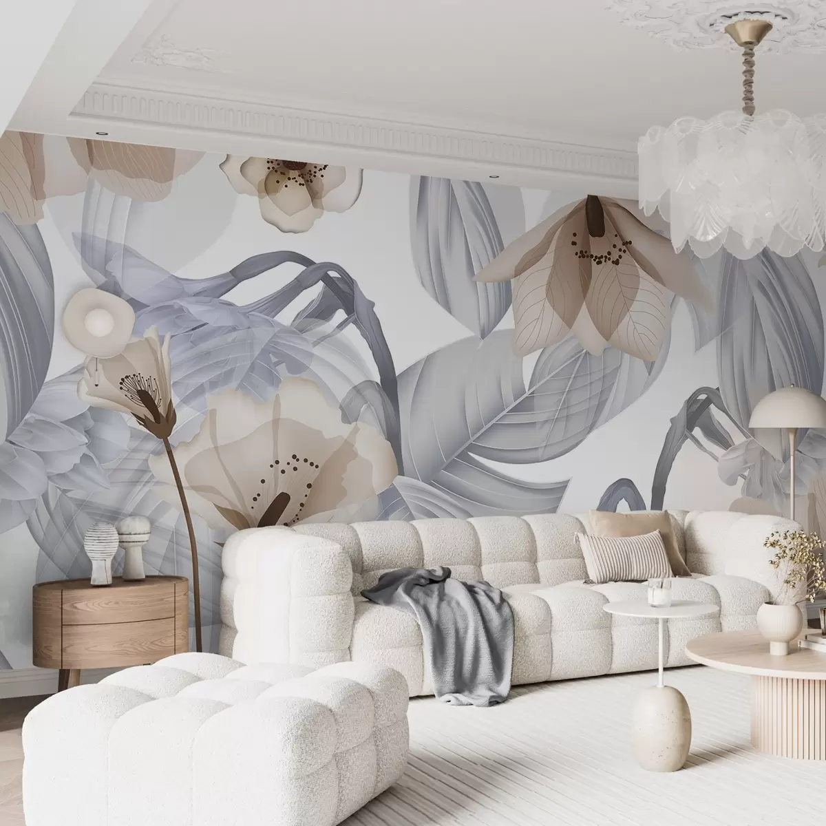 Fototapeten Braune Blüten und graue Blätter, botanischer Blumenhintergrund, elegantes Design, sanfte Farben, leichte, zarte Details N° w09497v1