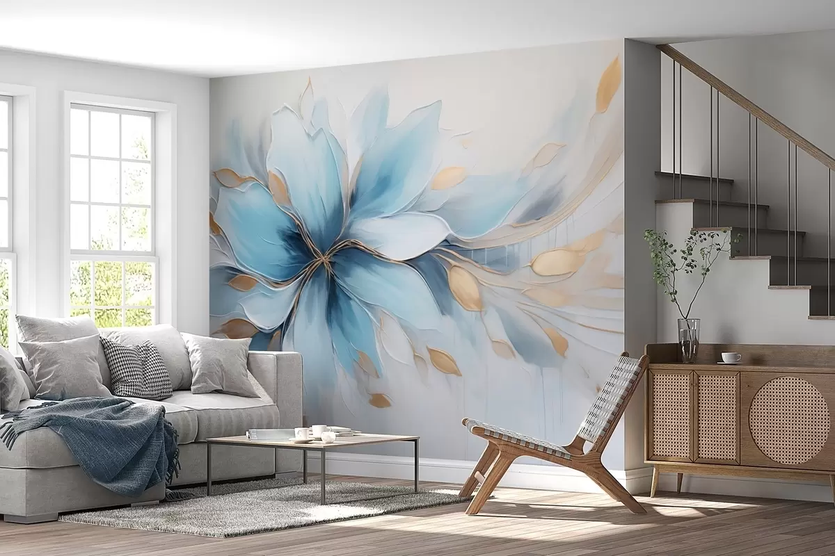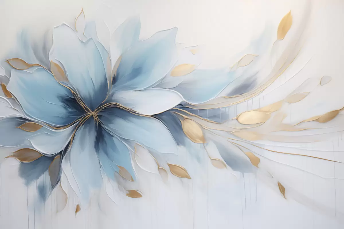 Fototapeten Abstrakte blaue Blume der Ruhe mit goldenen Blättern N° w09500