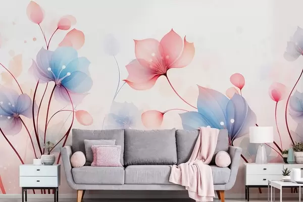 Fototapeten Zarte rosa-blaue Blumen – luftige Flora auf weißem Aquarellhintergrund N° w09507