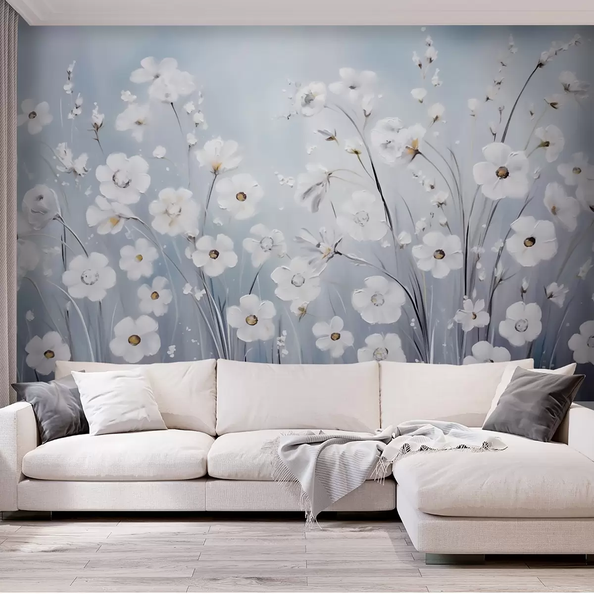 Fototapeten Weiße Blumen vor blauem Himmel im Ölgemälde-Stil N° w09516