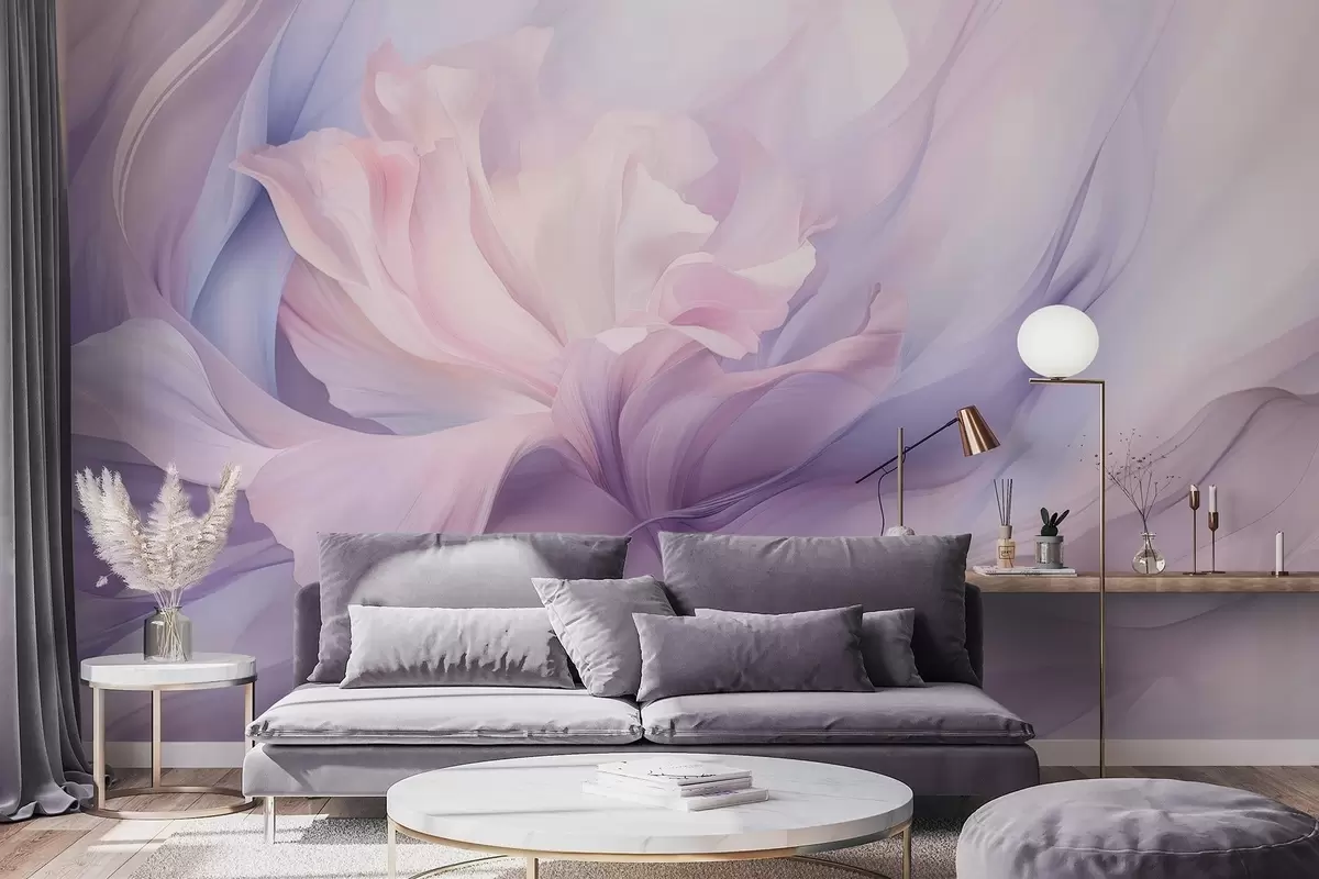 Fototapeten Sanfter Blütenstaub: eine luftige Blume in einem pastellfarbenen, lila Nebel N° w09517
