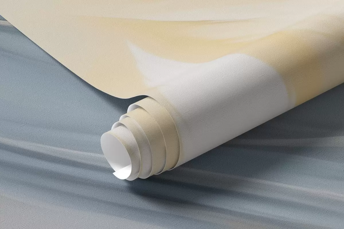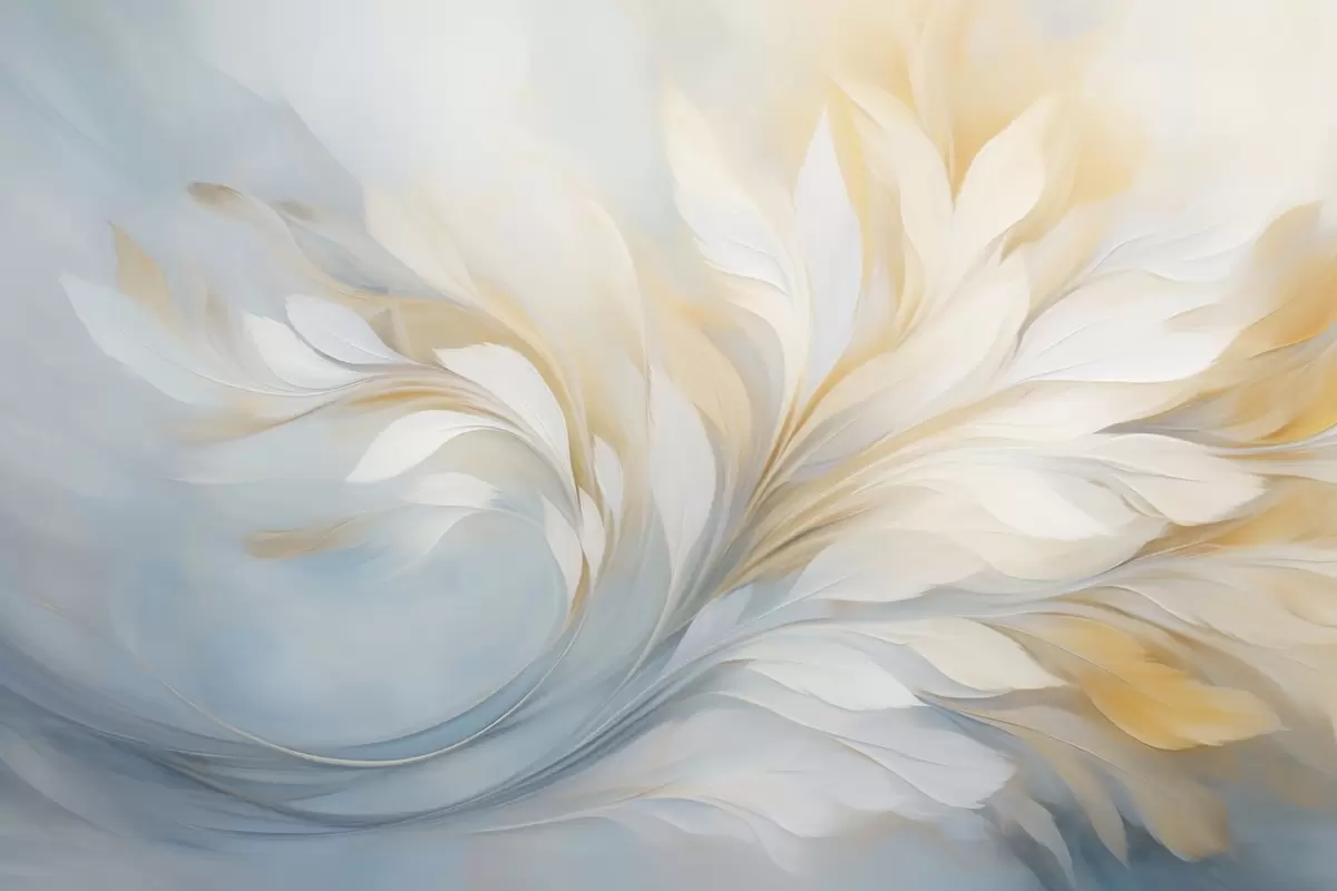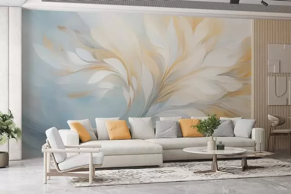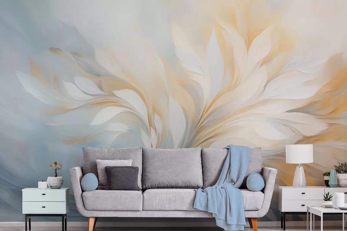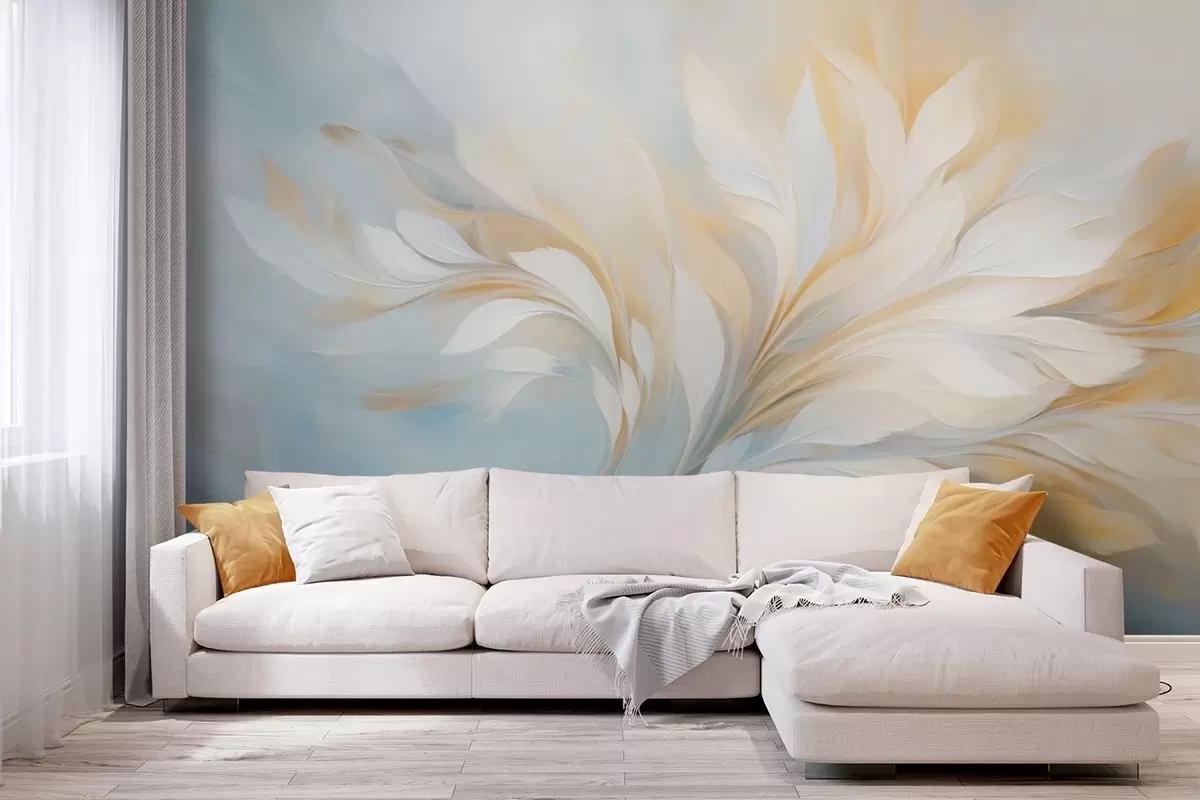 Fototapeten Abstrakte Komposition aus glatten, federartigen Formen in Gelb- und Blautönen N° w09525