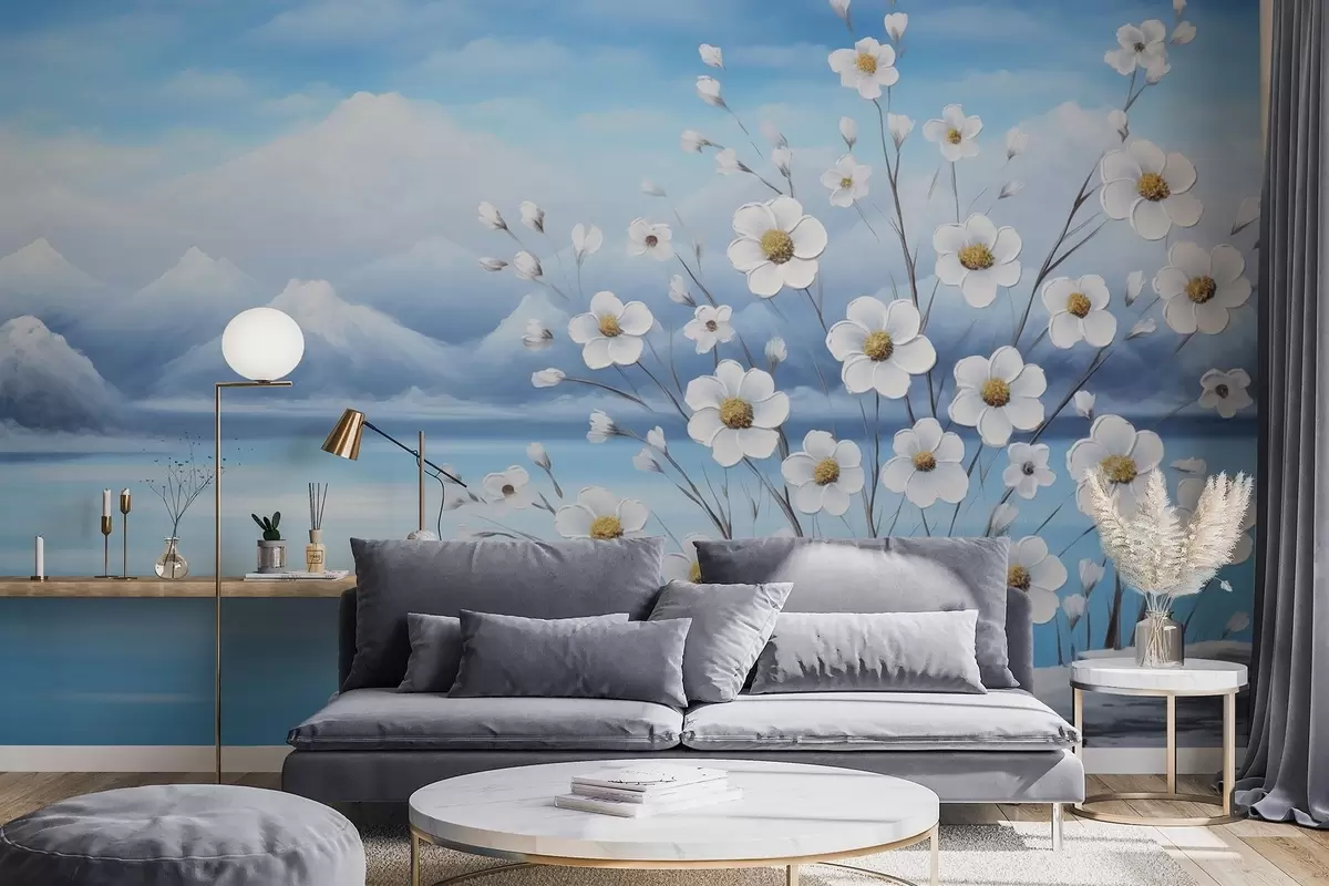 Fototapeten Weiße Frühlingsblumen an einem zugefrorenen See mit schneebedeckten Bergen im Ölgemälde-Stil N° w09526