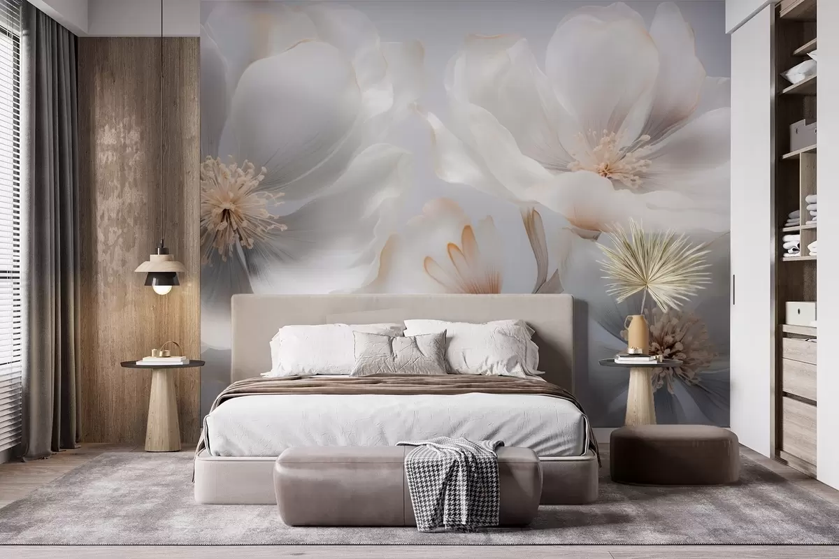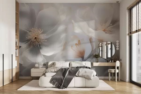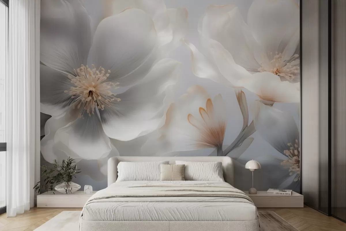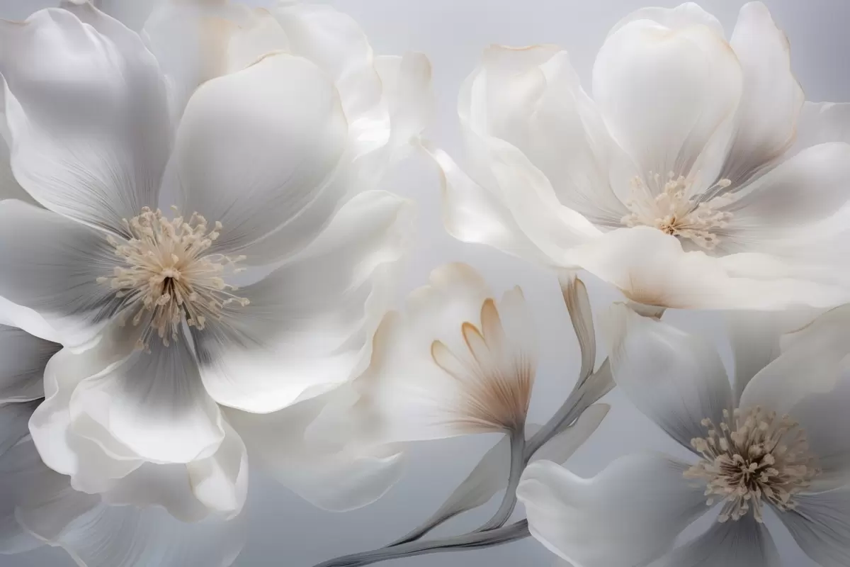 Fototapeten Perlmuttfarbene Blüten in Beige-Grau- und Milchcreme-Tönen N° w09527