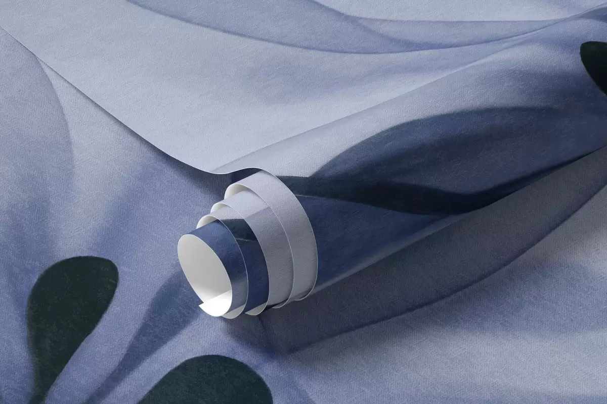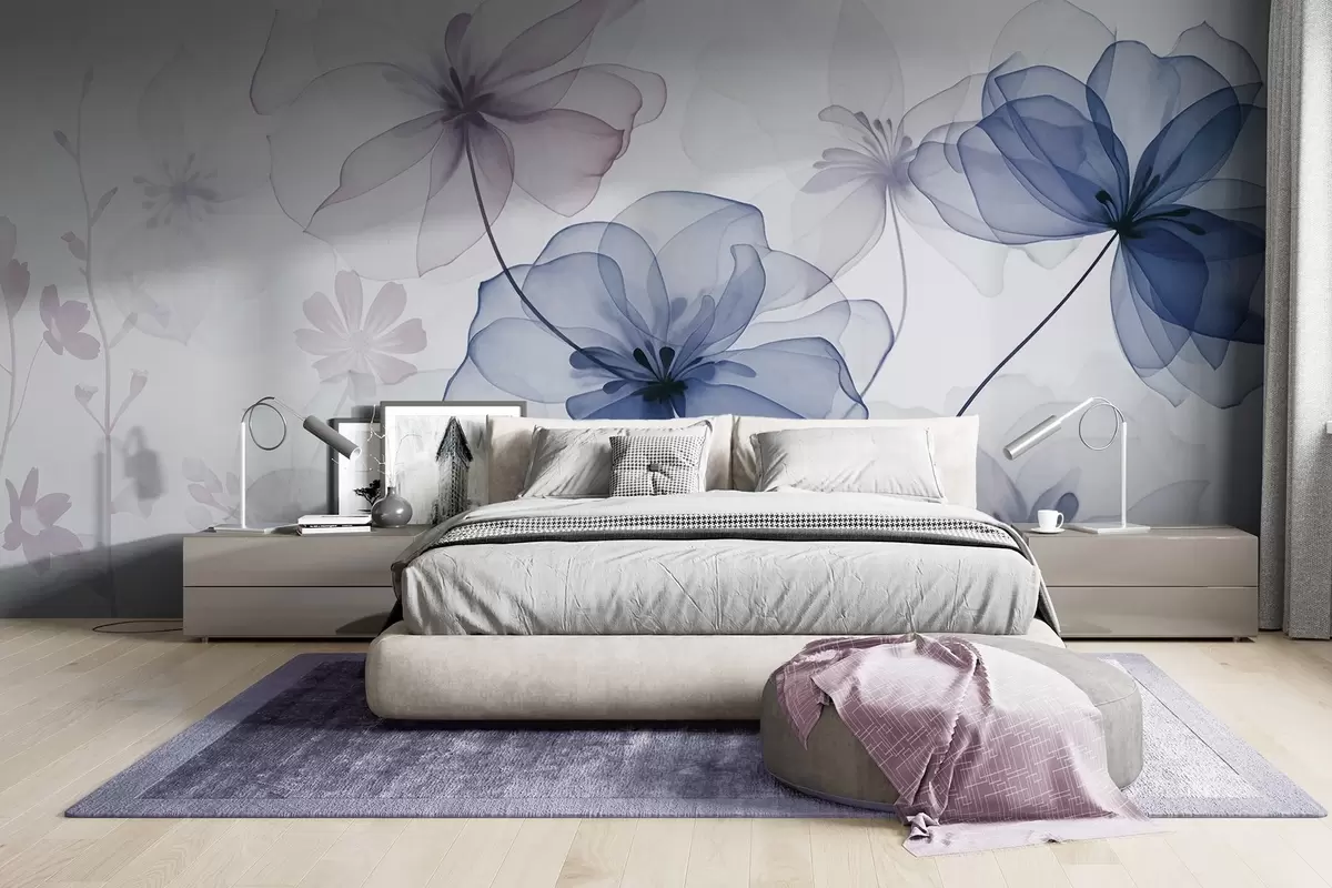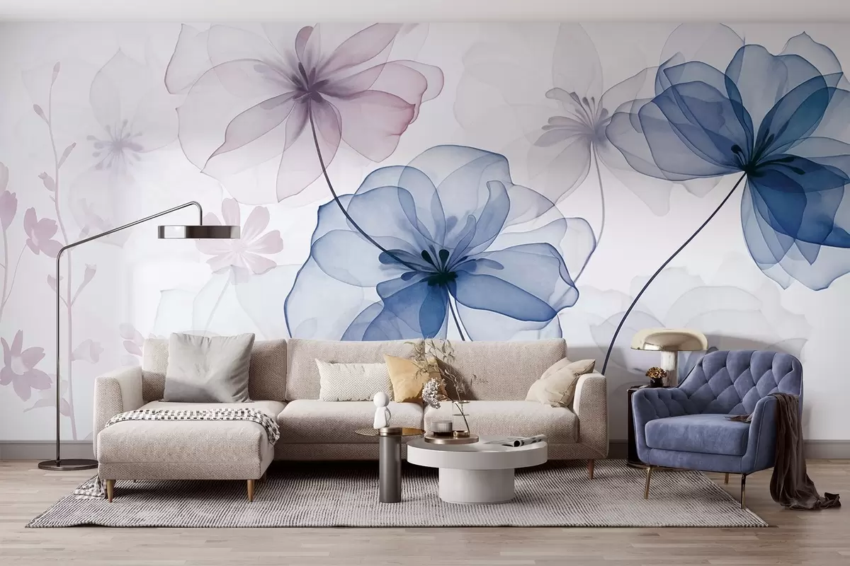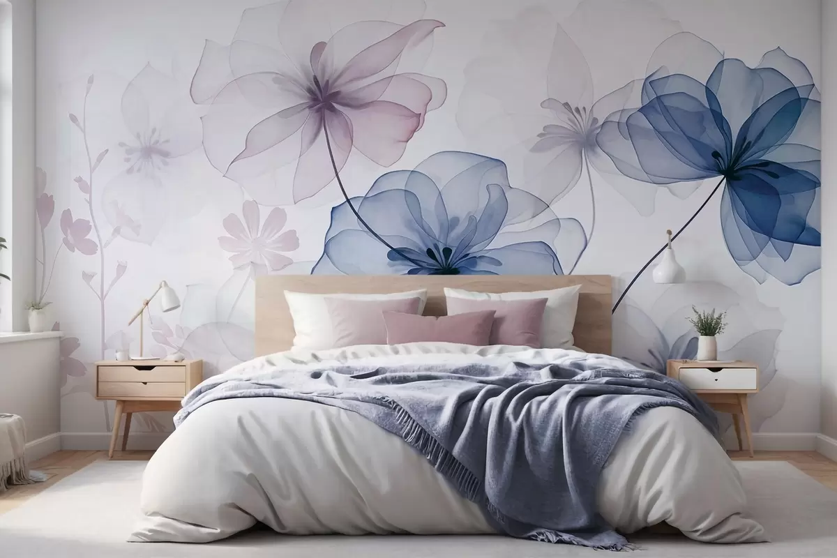 Fototapeten Durchscheinende Blumen mit gedeckten blauen und rosa Blütenblättern, langen Stielen, hellem Hintergrund, sanften Farben und strukturiertem Blumenmuster N° w09529v1